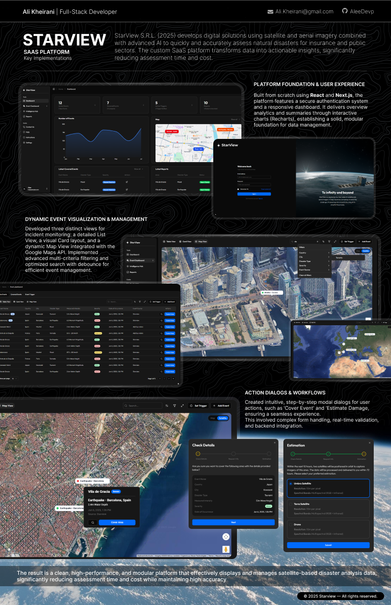 Transforms satellite data of natural disasters into clear, actionable insights. Features a responsive dashboard with live events, statistics, and analysis views.